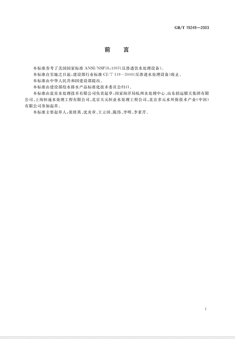 本标准编制过程中,参照采用了美国国家标准ANSI/NSF58:1997《反渗透饮水处理设备》。
