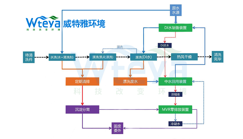 原水 → DI制备装置 → DI浓水 → 漂洗废水 → 中水回用装置 → MVR零排放装置 → 固废委外